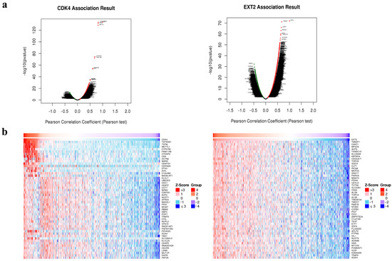 Co-expression networks of CDK4 and EXT2. (a) Volcano plots show highly correlated genes of CDK4 (left) and EXT2 (right) tested by Pearson test in the glioblastoma (GBM) cohort by the LinkedOmics database. Dark red dots indicate genes positively correlated; dark green dots indicate genes negatively correlated. (b) Top 50 positive co-expressed genes of CDK4 (left) and EXT2 (right) in heat maps in the GBM cohort by the LinkedOmics database.