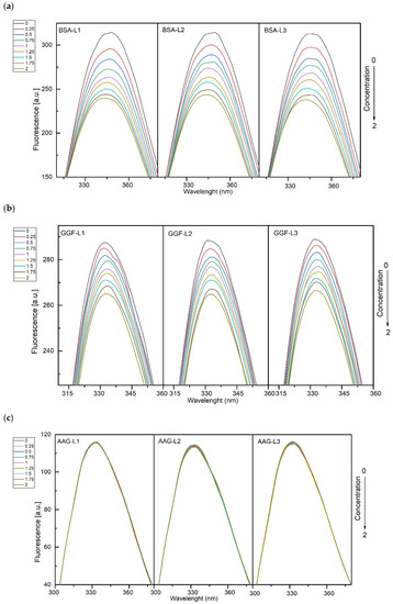 Fluorescence spectroscopy was carried out to characterize the mechanism of the interaction between three plasma proteins, BSA, AAG, and GGF, with the studied peptides. The fluorescence spectra of protein were collected during titration of L1–L3. The excitation wavelength was set at λ = 280 nm (both Trp and Tyr residues were excited). The fluorescence plots are presented in Figure 1a–c. For L1–3/BSA and L1–3/GGF systems, the results indicate interactions between proteins and peptides. With increasing L1–L3 concentrations, the fluorescence intensity decreases. A blue shift in the maximum of the emission peak is also observed. This suggests that the microenvironment around the chromophore of proteins changes and the amino acid residues are located in a more hydrophobic environment [53]. For the L1–3/AAG systems, as shown in Figure 1c, fluorescence intensity upon titration of L1–L3 hardly changes. This suggests a very weak interaction as a result of the collisional encounters.