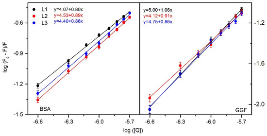 Double logarithm regression plots for quenching of BSA (left) and GGF (right) by peptide L1–3.