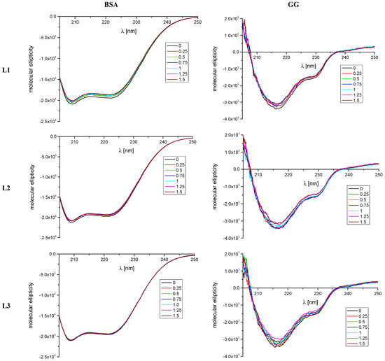 According to fluorescence spectroscopy experiments, the studied oligopeptides did not have significant interaction with AAG. Considering these results, it was decided to limit further research to interactions with BSA and GGF. Circular dichroism spectroscopy, similar to fluorescence and FTIR spectroscopies, is a useful method to determine the changes in the secondary structure of proteins in case of the presence of compounds that can interact with protein molecules [61,62]. Therefore, in this study, the CD spectra for BSA protein and GGF fraction, in the absence and presence of analyzed peptides L1, L2, and L3, were measured (Figure 3). We wanted to check the changes in the course of the spectrum after adding every portion of the analyzed peptides, from 1:0 to 1:1.5 protein to L1–L3 molar ratios. The obtained results were analyzed by the CD Multivariate SSE program, and are summarized in Table 4 and Table 5.