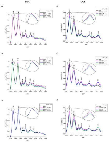 The ATR-FTIR spectra of free BSA, GGF, and with added oligopeptides where the molar ratio protein/peptide was 1:0.5, 1:1, 1:1.5, the concentration of protein was 6.5 ×10−4 M, (a) BSA/L1, (b) BSA/L2, (c) BSA/L3, (d) GGF/L1, (e) GGF/L2, (f) GGF/L3.