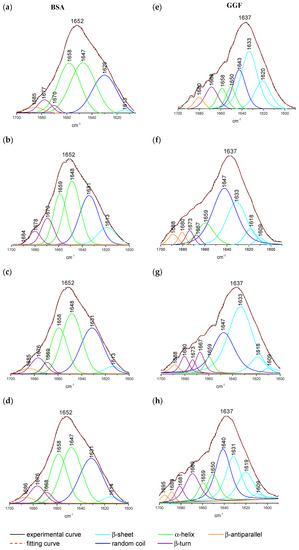 The fitting of Amide I peak of free (a) BSA, (e) GGF, and with added oligopeptides with equimolar ratio: (b) BSA/L1, (c) BSA/L2, (d) BSA/L3, (f) GGF/L1, (g) GGF/L2, (h) GGF/L3.