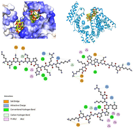 For interactions with serum albumin, fluorescence quenching experiments indicated that in the presence of two site markers, phenylbutazone (PHB) and ibuprofen (IBP), the binding constant for BSA/L1–L3 systems slightly decreases (Table 7). This result suggests low affinity for the interaction inside the pocket, where PHB and IBP bind. Therefore, docking studies were carried out on three subdomains [36,75,77,78]. The results are collected in Table 7. Negative binding energies were obtained at each docking, suggesting that L1–L3 can bind to multiple pocket sites: two Sudlow sites (sites 1 and 2 [34,60]) and site 3 in domain I. However, the highest affinity was observed for the interaction in the pocket of domain I: −5.5 kcal/mol for L1, −6.1 kcal/mol for L2, and −6.2 kcal/mol for L3. This is a long hydrophobic channel where long chain fatty acids bind [77,79], or several clinical drugs [80]. However, the difference in binding affinity between sites 3 and 2 is not great: only 0.2 kcal/mol for L1 and L2, and 0.4 kcal/mol for L3. When the pocket in domain I is blocked by fatty acids, the studied compounds can interact with site 2. Site 2 also binds some synthetic cationic antimicrobial peptides (CAP) [81]. Site 1 in domain II is the least preferred (Table 7). Figure 6 presents the interactions and position of compounds L1–L3 in site 3 in domain I. For all ligands, cationic regions are involved in interactions with serum albumin. Several hydrogen bonds are observed. Leu112 interacts with N-terminal amine N-For L1, Arg185 with a peptide bond, Tyr160, and Lys116 with the oxygen of the carbonyl group, Tyr137 with NH of the imidazole ring of the histidine side chain. Salt bridge contacts are observed between Glu residues and non-proteinogenic amino acids, Dab and Orn, and similarly with the guanidine group of the side chain of Arg and with 1,4-diaminobutane (Dbt) on C-terminal. Additionally, the L1-BSA complex is stabilized by π-alkyl interaction with the imidazole ring of the histidine side chain. L2 and L3 in a similar manner interact with albumin. Hydrogen bonds, salt bridge, π-alkyl, or hydrophobic interactions with alkyl alkyl group contacts are observed. Hydrogen bonds are formed with the oxygen of the carbonyl group of the peptide chain. The cationic area of Dab, Orn, and Lys are involved in salt bridge contacts. Proline and phenylalanine rings interact by π-alkyl or alkyl contacts. Further details are shown in Figure 6.