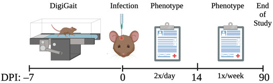 Prior to infection, different aspects of gait were measured via DigiGait. Then, mice were infected with TMEV or sham-infected (control). Mice were evaluated for neurological phenotypes twice a day for the first 14 d.p.i. and once a week thereafter until 90 d.p.i. The phenotype scores obtained throughout the 90 days were statistically associated with the pre-infection DigiGait measurements.