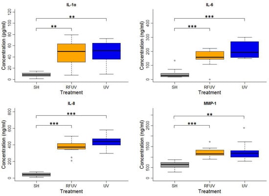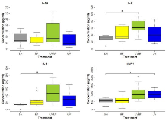 In the experiments performed following the additive effect protocol, the skin tissues were first exposed to 2 SED UV and then to 4 W/kg RF. There were no significant differences in the IL-1α cytokine concentration between the groups of treatments. A significant difference in IL-6 concentration was found between the SH- and UVRF-exposed treatments. There was a significantly increased IL-8 concentration in the UVRF-exposed samples compared to the SH ones. The difference in the concentration of the MMP-1 enzyme was marginally significant between the samples with sham and UV-only exposure. The samples treated with RF radiation were not significantly different from any other samples. Moreover, the UVRF treatment slightly (but not significantly) elevated the IL-1α, IL-6 and IL-8 concentrations as compared to the UV treatment (Figure 1).