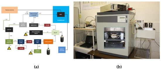 (a) Block diagram of a Wi-Fi exposure system; (b) arrangement of a whole-exposure system where the wire patch cell (WPC) exposure chambers (see the inserted photograph on the door of the thermostat) were placed in a CO2 incubator.