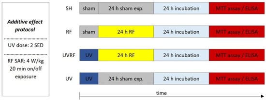In the case of the first study—for better understanding called the additive effect protocol—2 SED UV irradiation (as the first exposure) was followed immediately by 24 h of RF irradiation with 4 W/kg as the second exposure (Figure 5).