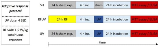 Under the second study—called the adaptive response protocol—the tissues were pre-exposed to RFs (24 h, 1.5 W/kg) and, after a 4 h incubation period, 4 SED UV radiation (Figure 6) was applied.