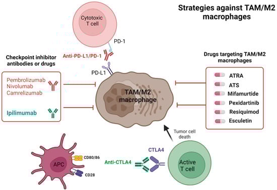 TAM/M2 macrophage targeting strategies. In the tumor microenvironment, T cells express PD-1, which can interact with its ligand PD-L1 on cancer cells as well as M2 macrophages, resulting in the inactivation of T cell function. Anti-PD-L1/PD-1 antibodies block this interaction, and T cells are subsequently activated and have anti-cancer activity. The repolarization of M2 macrophages to the M1 phenotype also reduces PD-L1 expression in the tumor microenvironment. Various agents that can re-polarize TAMs/M2 macrophages are being developed, and those under development as strategies to target the macrophage population are shown in the image. Adapted from “Immune Therapy in Multiple Myeloma”, by BioRender.com (2023). Retrieved from https://app.biorender.com/biorender-templates (accessed on 30 January 2023).