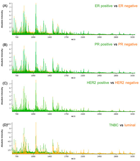 Comparison between the average spectra of the different classes used in the classification models: (A) ER-positive versus ER-negative; (B) PR-positive versus PR-negative; (C) HER2-positive versus HER2-negative; and (D) TNBC versus luminal. ER—estrogen receptor; PR—progesterone receptor; HER2—human epidermal growth factor receptor-2.