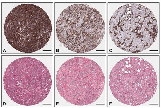 Exemplary images of vimentin IHC and corresponding H&E: (A,D) TNBC with strong positivity within the tumor cells as well as the tumor stroma; (B,E) TNBC with intermediate positivity within the tumor cells and strong positivity within the tumor stroma; (C,F) non-TNBC with no vimentin staining within the tumor cells and strong positivity within the tumor stroma. Scale bar—200 μm.