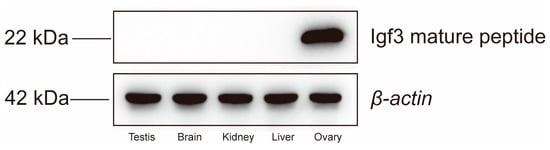 Western blot analysis was performed using homogenized extracts of liver, kidney, brain, testis and ovarian tissue samples using RIPA buffer (Thermo Scientific, Waltham, MA, USA). Tissue proteins were separated by using 12% sodium dodecyl sulfate–polyacrylamide gel electrophoresis (SDS-PAGE) and electrotransferred to a polyvinylidene fluoride (PVDF) membrane (Thermo Scientific, Waltham, MA, USA). Primary anti-Igf and β-actin (Invitrogen, USA) antibodies were incubated with the blots at 1:1000 dilutions for 45 min. Secondary antibodies were incubated with homogenates from testis, brain, kidney, liver and ovarian tissues before adding to the primary antibody blots. Electrochemiluminescence (ECL) detection was performed to observe the results (Applygen, Haidian, Beijing, China).