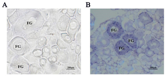 Immunohistochemical detection of Igf3 in E. coioides ovarian tissues. (A) negative control lacking primary antibody. (B) Igf3-specific polyclonal primary antibody. Note: FG indicates full grown stages of follicular.