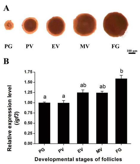 Stage-dependent expression of igf3 in developing E. coioides follicles. (A) Morphology of E. coioides follicular at different stages of maturation. PG—primary growth; PV—previtellogenic; EV—early vitellogenic; MV—midvitellogenic; FG—full-grown. (B) Expression of igf3 mRNA during different stages of ovarian follicle development. Different letters (a and b) indicate significant differences.