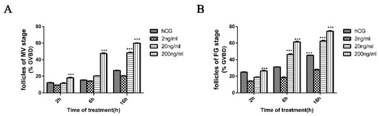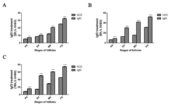 We utilized recombinant Igf3 to determine whether this could alter ovarian follicle development when added externally to follicular at the MV and FG phases of development. At a low (2 ng/mL) Igf3 level, the GVBD of follicular in neither MV nor FG significantly changed over time. At higher (20 ng/mL) concentration, the GVBD of MV phase cells was significantly up-regulated after 16 h, and for the FG phase, this occurred after 6 and 16 h. Under high level (200 ng/mL) Igf3, GVBD of follicular in MV and FG phases reached levels of significance at all three treatment times (Figure 5). Therefore, we extended the experiment and treated and examined the level of GVBD of follicular in the PV, EV, MV and FG phases by using 200 ng/mL Igf3. In all the developmental phases, Igf3 induced GVBD. However, the effects were more pronounced in the more mature follicular and as the exposure time increased (Figure 6).