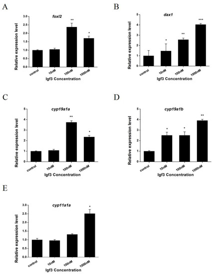 Igf3 added to primary ovarian cells increases expression of sex differentiation-related genes. (A) forkhead boxl2—foxl2; (B) dosage-sensitive sex reversal adrenal hypoplasia critical region on chromosome x gene 1—dax1; (C) cytochrome P450 family 19 subfamily member 1 a—cyp19a1a; (D) cytochrome P450 family 19 subfamily a1 member b—cyp19a1b; and (E) cytochrome P450 family 11 subfamily b member 2—cyp11a1. (n = 4). *, p < 0.05, **, p < 0.01, ***, p < 0.001.
