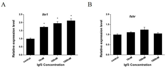 Effects of Igf3 treatment on primary ovarian cells on the expression of reproduction-related genes. (A) ihr1 and (B) fshr at the indicated dosages. (n = 4). *, p < 0.05.