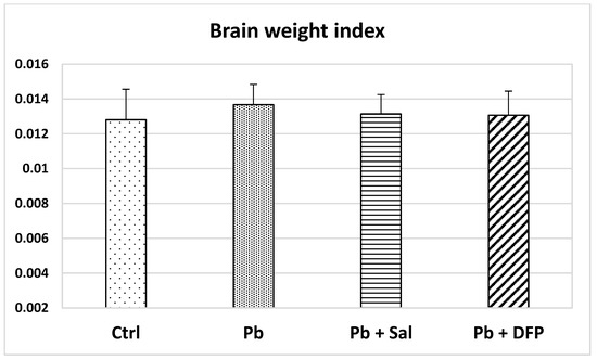 Brain weight index (BWI) was calculated as the organ-to-body weight ratio. The lowest value of BWI was found in the untreated control group (Figure 1). No statistically significant differences were found in BWI between the experimental groups.