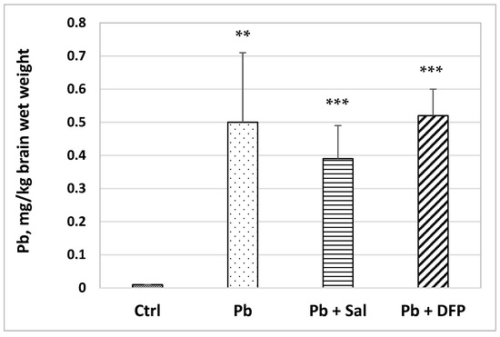 Pb concentration in the brains of experimental mice: Ctrl—untreated control group; Pb—Pb-exposed group; Pb + Sal—Pb-intoxicated mice treated with salinomycin; Pb + DFP—Pb-intoxicated mice treated with deferiprone. Data are presented as mean + SD. ** p < 0.01, *** p < 0.001 compared with the untreated control group.