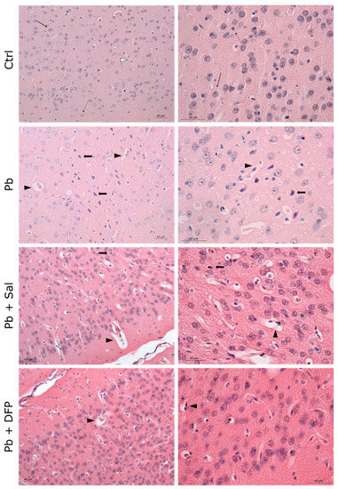 - Al-Khafaf, A.; Ismail, H.K.; Alsaidya, A.M.A. Histopathological effects of experimental exposure to lead on nervous system in albino female rats. Iraqi J. Veter Sci. 2021, 35, 45–48. [Google Scholar] [CrossRef]