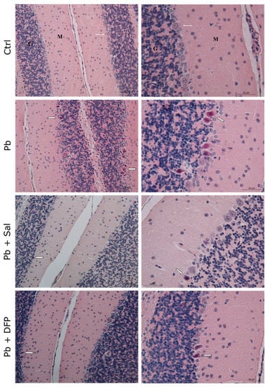 Our results for the effect of Pb on the levels of essential elements in the brain are supported by prominent histopathological findings in the Pb-exposed mouse brains. Degenerative changes were observed in both the cerebral and cerebellar cortical areas as dilated perivascular spaces and numerous necrotic cortical neurons and Purkinje cells were well demonstrated. These findings are in agreement with other animal studies of Pb neurotoxicity [18,27,28,29]. For example, Sidhu and Nehru [27] have demonstrated disorganization of cells in the cerebral and cerebellar cortical layers in Pb-exposed rats. Khafaf et al. [29] have reported the degeneration and necrosis of rat cortical neurons and Purkinje cells, as well the congestion of blood vessels, neuronophagia, and focal gliosis. Brain edema has been documented in the hippocampus of Pb-exposed rats together with focal gliosis in the cerebrum and cerebellar vacuolization [18]. As has been shown, the prefrontal cortex, cerebellum, and hippocampus are the brain regions most vulnerable to Pb exposure, also evidenced in the developing brain [30]. The degenerative morphological changes in our study could be attributed to oxidative damage. Pb is reported to inhibit antioxidant defense enzymes, such as superoxide dismutase, catalase, and glutathione peroxidase [31,32]. In fact, oxidative stress is considered a key aspect of Pb neurotoxic effects [2,33].
