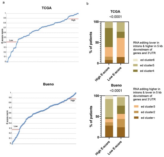 We have recently described [] how unsupervised clustering of the TCGA [] and Bueno’s [] cohorts of PM samples, based on the genomic localization of RNA editing sites, separated them into six groups, with the largest editing differences in introns: regions 5 kb downstream of genes and 3′UTR regions. RNA editing clusters 1, 2 and 3 have, on average, the highest rate of RNA editing in introns and the lowest editing rate in 5 kb downstream of gene and 3′UTR compared to clusters 4, 5 and 6 (Table S1). We have observed a similar pattern in primary mesothelioma cultures, suggesting that the editing activity heterogeneity in tumor tissue is also present in tumor cells. To investigate the relationship between gene expression profile and RNA editing clusters, we took advantage of the recent characterization of TCGA and Bueno’s samples using the normalized epithelioid score (E-score), which has been estimated based on the transcriptome analysis, and has demonstrated that pleural mesotheliomas have different proportions of epithelioid and sarcomatoid components (E-score and S-score) []. Since the E-score is not normally distributed (Figure 1a), we selected in each cohort the samples with the highest and lowest E-score to explore the frequency of the occurrence of the six RNA editing clusters in each of the two groups. Patterns of RNA editing varied significantly in the two groups (Figure 1b). The group with the highest norm E-score has a higher RNA editing frequency in 3′UTR and 5 kb downstream of the gene and a lower frequency of editing in introns regions compared to the group with the lowest E-score.