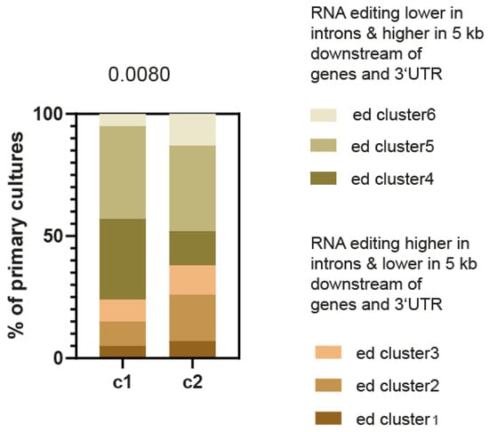 To further support the effect of different RNA editing patterns upon EMT, we next analyzed the rate of the different RNA editing clusters in the primary mesothelioma cultures that we have robustly classified into two groups (C1 and C2) with different molecular profiles, gene alterations and histology subtypes. The epithelioid histotype is found in both groups, and tumors classified in the C2 group are associated with a worse survival prognosis. The C1 group exhibits more frequent BAP1 alterations and the C2 group presents a mesenchymal phenotype []. As for the tumor transcriptome described above, the RNA editing pattern significantly changed with the same trend for a lower frequency of editing in 3′UTR and 5 Kb downstream of the gene region, with higher RNA editing in introns upon EMT (Figure 2). This confirms, using an independent phenotype classification, that RNA editing associates to EMT phenotype.