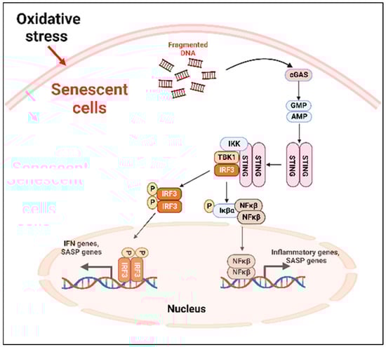 SASP factors can be expressed by various mechanism depending on the cell types [71]. The nuclei of the primary senescent cells released fragmented genomic DNA into the cytoplasm. The cyclic guanosine monophosphate (GMP)–adenosine monophosphate (AMP) synthase (cGAS) senses the cytoplasmic DNA in the form of cyclic dinucleotides. The cyclic GMP-AMP (cGAMP) complex then activates a stimulator of interferon genes (STING) located in the endoplasmic reticulum. The activated STING combines with TANK-binding kinase 1 (TBK1) and phosphorylates the transcription factors interferon regulatory factor 3 (IRF3) and nuclear factor ‘kappa-light-chain-enhancer’ (NFκB), causing its nuclear translocation and the further activation of the SASP gene expression (Figure 2) [71].