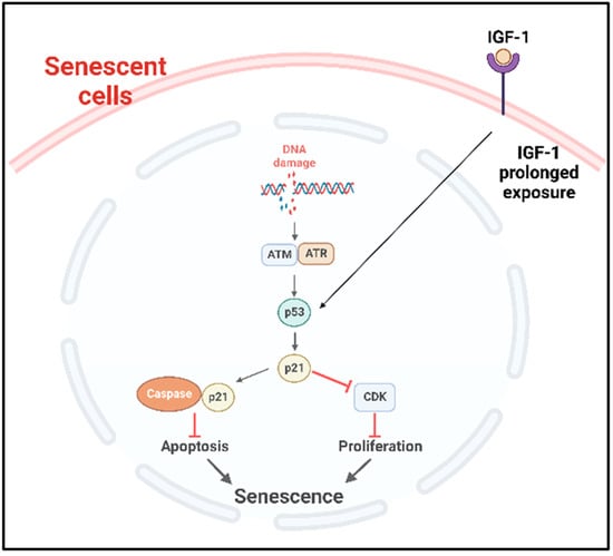 p53 plays an important role in the onset of cellular senescence. The telomeric erosion and the DNA damage response pathway leads to the activation of p53 [72,73]. In response to the DDR, the stress sensors’ telangiectasia-muted (ATM) or ataxia telangiectasia and Rad3-related (ATR) kinases are activated, which in turn activate the p53/p21cip1 with p53 stabilization [72]. The p21cip1 is one of the founding members of the mammalian CDK inhibitor family and, upon activation, p21cip1 binds with many apoptotic genes, including caspases; as a result, it inhibits apoptosis and induces senescence [74]. p53 also plays as a molecular switch in the insulin-like growth factor-1 (IGF-1)-induced cellular premature senescence. Increased IGF-1 levels are associated with cancer progression [75]. Tran et al. have shown that long-term IGF-1 exposure increased p53 acetylation, leading to p53 stabilization which ultimately induced premature senescence (Figure 3) [76].