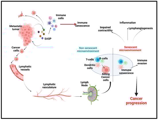 In a protumorigenic location such as the LN, the decreased ability to recruit immune cells because of senescence directly correlates with increased tumor development. Senescent cells are shown to actively secrete immunosuppressive cargoes that further increase the senescence of recipient immune cells such as M2 macrophages, myeloid-derived suppressor cells, and regulatory T-cells that further contribute to the inflammatory cascade and accelerate senescence and tissue aging [147]. It has additionally been demonstrated that dendritic cell recruitment in mouse lungs was decreased by the age-related increase in prostaglandin-2, diminishing the T-cell response [148]. Altogether, these findings showcase the competence of senescent cells for clearing way to tumor cells within the constructed immunosuppressive environment (Figure 5).
