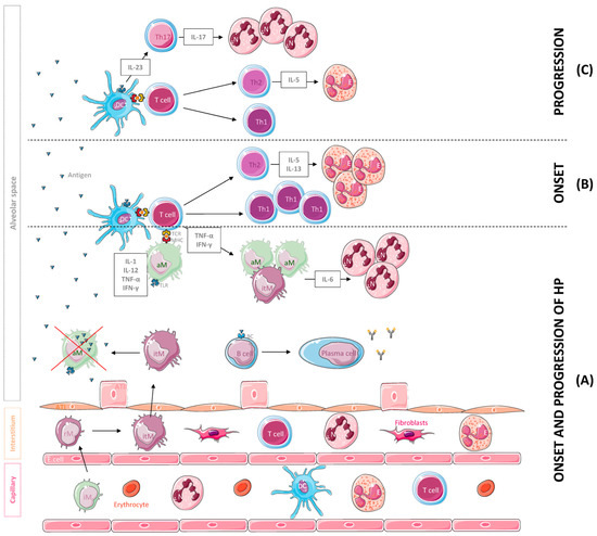 Leukocyte population and cytokines mainly involved in the onset and the progression of hypersensitivity pneumonitis (HP). (A) Following inhalation, the antigen is phagocytosed and degraded by dendritic cells (DCs) and macrophages and coupled to MHC molecules. The antigen is then recognized by T cells that secrete cytokines such as IFN-γ and TNF-α, inducing the accumulation, activation and aggregation of IL-6-producing macrophages, a potent chemoattractant for neutrophil (N) recruitment and activation. A B cell response against the antigens also occurs, leading to the production of specific antibodies. For their part, alveolar macrophages (aMs) may undergo subsequent apoptosis after the phagocytosis of high levels of the antigen and inflammatory monocytes (iMs), which are recruited to the lung tissue from the vasculature and differentiate into resident monocytes (rMs) and interstitial macrophages (itMs) afterwards. Subsequently, itMs proliferate and migrate into the alveolar space to restore this depleted population. (B) In the onset of the disease, T cells differentiate into Th1 and Th2 effectors, and Th2 cells release cytokines such as IL-5 and IL-13 that promote eosinophil recruitment and activation. (C) With progression of the disease, Th2 cells decrease IL-5 secretion, resulting in a reduction in eosinophils in the site of inflammation. In addition, DCs start secreting IL-23, a cytokine that promotes Th17 cell differentiation, IL-17 secretion and neutrophil aggregation. Abbreviations: ATI, alveolar type I cell; ATII, alveolar type II cell; E. cell, endothelial cell.