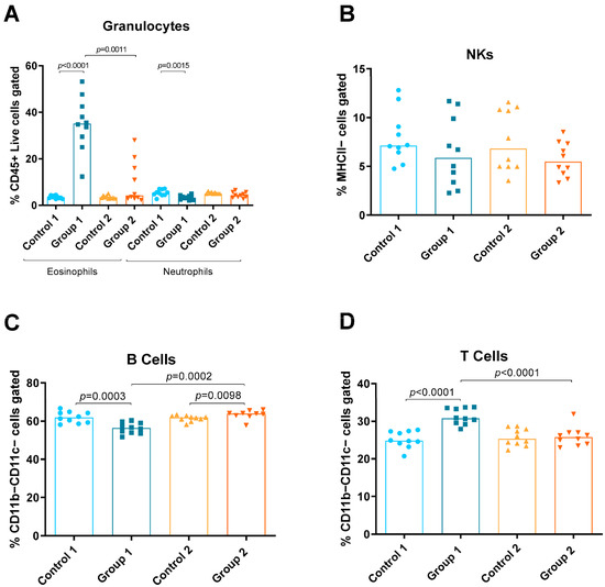 Granulocyte, natural killer (NK) cell and lymphocyte levels in lung homogenates from flow cytometry analysis. Experimental groups are the same as in Figure in Section 4.3. In each group, data are shown as individual and median values of eosinophils and neutrophils (A), NK cells (B), B cells (C) and T cells (D).