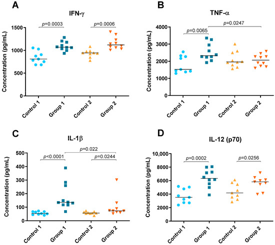 Th1 cytokine concentration (pg/mL) in lung tissue homogenate. In each group, data are shown as individual and median values of IFN-γ (A), TNF-α (B), IL-1β (C) and IL-12 (p70) (D).