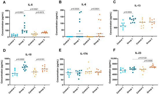 In both groups, Groups 1 and 2, significant increases were observed in Th2 cytokines such as IL-5 (p < 0.0001 and p = 0.0072, respectively) and IL-6 (p = 0.0325 and p = 0.0031, respectively) but also in IL-10 (p = 0.0002 and p = 0.0181, respectively) (Figure 5A,B,D). However, the concentration of IL-5 was higher in Group 1 than in Group 2 (p = 0.0021) (Figure 5A). Significant differences were also observed between Group 1 and its control group for IL-13, which was higher in the group exposed to pigeon serum (p = 0.0004) (Figure 5C). The concentration of IL-23 was higher in Group 2 than in the respective control and Group 1 (p = 0.0009 and p = 0.0122, respectively) (Figure 5F). No significant differences were observed for IL-17A between groups (Figure 5E).