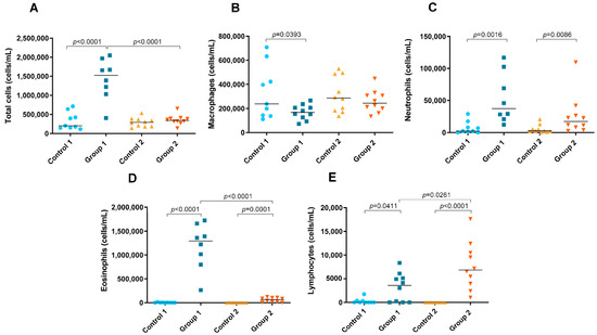 A significant increase in the number of total cells in BAL fluid was observed in Group 1 compared with its control group (p < 0.0001) (Figure 6A). In addition, the total cell count was significantly higher in the group exposed for less time to pigeon serum than in Group 2 (p < 0.0001) (Figure 6A). In Group 1, a significant decrease in the number of macrophages was observed compared with its control group (p = 0.0393) (Figure 6B). In both groups of the disease, increases in the neutrophil (p = 0.0016 and p = 0.0086, respectively), eosinophil (p < 0.0001 and p= 0.0001, respectively) and lymphocyte counts (p = 0.0411 and p < 0.0001, respectively) were observed compared with the control groups (Figure 6C–E, respectively). However, the number of eosinophils was significantly lower in Group 2 than in Group 1 (p < 0.0001) (Figure 6D), while the lymphocyte count was higher (p = 0.0261) (Figure 6E).