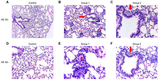 Representative images of haematoxylin and eosin (HE) stained histological lung sections. Experimental groups in this figure are represented with sections at 20× and 40× magnification from control group (A,D), Group 1 (B,E) and Group 2 (C,F). (A,D) Normal lung parenchyma. (B) Lung tissue with cellular bronchiolitis (big arrow), patchy interstitial pneumonitis (thin arrows) and giant cell (star). (E) Higher magnification of the giant cell (star). (C,F) Lung tissue with mild cellular bronchiolitis (big arrow).