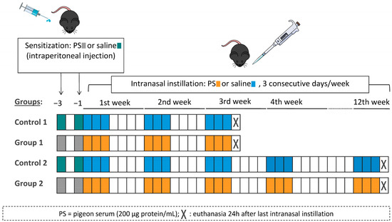 Flow chart of the experimental design and the four experimental groups. Mice were sensitized by intraperitoneal injection with 100 µL of pigeon serum (PS) or saline on days −3 and −1 and then received intranasal instillations of 40 µL of PS or saline on three consecutive days/week for 3 weeks (Group 1) or 12 weeks (Group 2). Mice were sacrificed 24 h after the last intranasal instillation.