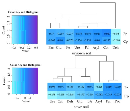 Soil cropping with Zea mays enhanced activities of all enzymes except for arylsulfatase in the soil contaminated with permethrin and β-glucosidase in the soil contaminated with cypermethrin (Figure 2). In the soil contaminated with permethrin, Zea mays stimulated the activity of dehydrogenases by 753.9%, acid phosphatase by 53.6%, urease by 53.3%, catalase by 34.2%, β-glucosidase by 27.8%, and alkaline phosphatase by 13.8%; in the soil contaminated with cypermethrin, Zea mays increased the activity dehydrogenases by 661.0%, acid phosphatase by 49.8%, arylsulfatase by 32.8%, urease by 29.7%, catalase by 29.5%, and alkaline phosphatase by 15.3%.