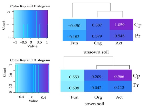 The index of IFin attained positive values in the case of organotrophic bacteria and actinobacteria as well as negative ones in the case of fungi. Changes in the abundance of microorganisms in the soil were affected to a greater extent by cypermethrin than by permethrin. A stronger effect of both insecticides on organotrophic bacteria and actinobacteria was observed in the bare soil than in the soil sown with Zea mays (Table S2). An opposite effect was noted in the case of fungi, i.e., higher negative values of IFin were noted in the sown soil. In the soil used as black fallow, a significant shift in the proliferation rate occurred only in the case of actinobacteria under the effect of cypermethrin, as indicated by the CD value (Table S3). This insecticide caused a significant decrease in CD values of all microorganisms in the soil sown with Zea mays. In the soil cropped with this cereal, the CD values decreased as well but only for organotrophic bacteria and fungi. The effect of Zea mays on the values of the CD index differed from the effects induced by the insecticides tested. Its cultivation increased the CD value computed for organotrophic bacteria by 32%, for actinobacteria by 60%, and for fungi by 25%. This was, however, not reflected in the ecophysiological diversity (EP) of these microorganisms as the EP value in the soil sown with Zea mays increased only for organotrophic bacteria, decreased only for actinobacteria, and did not change for fungi (Table S4). In this experimental series, the ecophysiological diversity of organotrophic bacteria and actinobacteria was diminished only by permethrin.