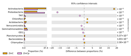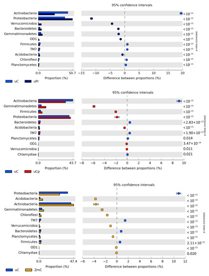 - Parks, D.H.; Tyson, G.W.; Hugenholtz, P.; Beiko, R.G. STAMP: Statistical Analysis of Taxonomic and Functional Profiles. Bioinformatics 2014, 30, 3123–3124. [Google Scholar] [CrossRef]