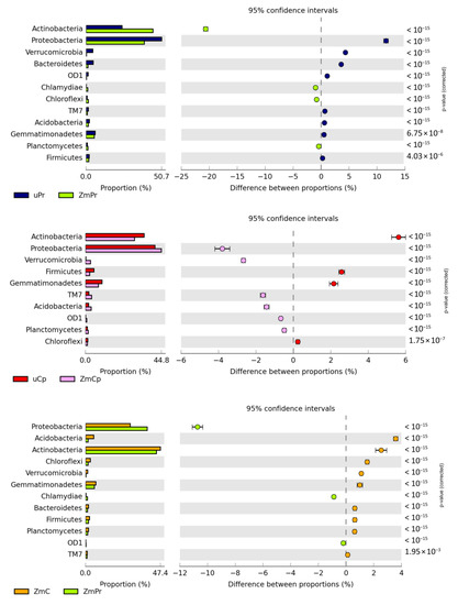 Relative abundance of dominant phylum bacteria in the soil. uC—contaminated unsown soil; uPr—sown soil contaminated with permethrin; uCp—sown soil contaminated with cypermethrin; ZmC—uncontaminated soil sown with Zea mays; ZmPr—soil sown with Zea mays contaminated with permethrin; ZmCp—soil sown with Zea mays contaminated with cypermethrin.
