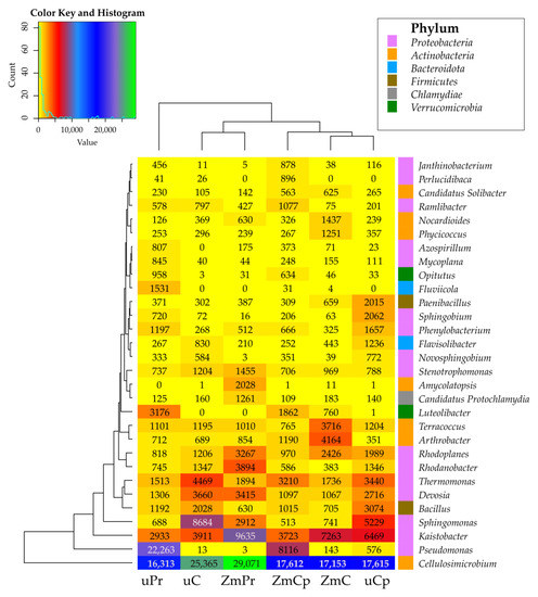 The relative abundance of the dominant bacterial genus in the soil. uC—contaminated unsown soil; uPr—sown soil contaminated with permethrin; uCp—sown soil contaminated with cypermethrin; ZmC—uncontaminated soil sown with Zea mays; ZmPr—soil sown with Zea mays contaminated with permethrin; ZmCp—soil sown with Zea mays contaminated with cypermethrin.
