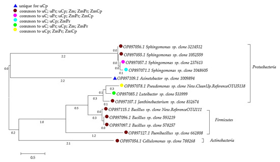 Phylogenetic tree of bacteria isolated from the soil made using the neighbor-joining method. uC—contaminated unsown soil; uPr—sown soil contaminated with permethrin; uCp—sown soil contaminated with cypermethrin; ZmC—uncontaminated soil sown with Zea mays; ZmPr—soil sown with Zea mays contaminated with permethrin; ZmCp—soil sown with Zea mays contaminated with cypermethrin.