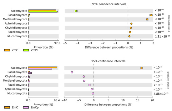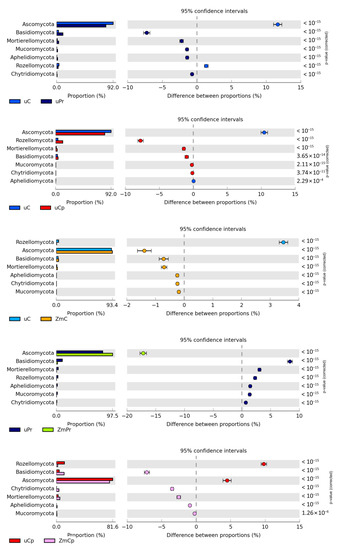 Relative abundance of dominant phylum fungi in the soil. uC—contaminated unsown soil; uPr—sown soil contaminated with permethrin; uCp—sown soil contaminated with cypermethrin; ZmC—uncontaminated soil sown with Zea mays; ZmPr—soil sown with Zea mays contaminated with permethrin; ZmCp—soil sown with Zea mays contaminated with cypermethrin.