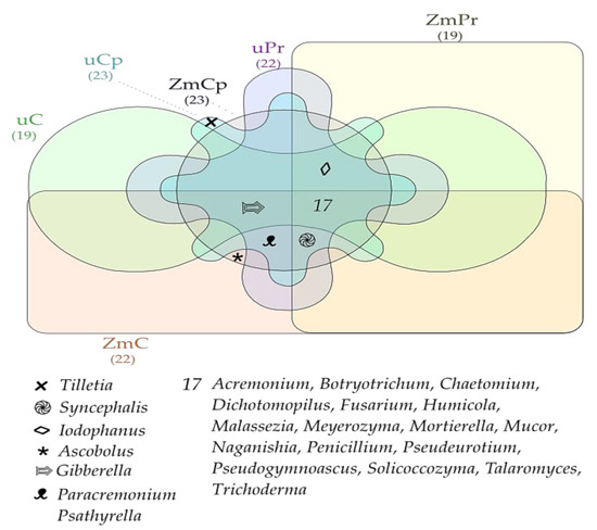 Venn diagram showing common and unique types of fungi in the soil. uC—contaminated unsown soil; uPr—sown soil contaminated with permethrin; uCp—sown soil contaminated with cypermethrin; ZmC—uncontaminated soil sown with Zea mays; ZmPr—soil sown with Zea mays contaminated with permethrin; ZmCp—soil sown with Zea mays contaminated with cypermethrin.