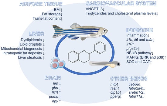 Therefore, considering their anti-inflammatory effects, it appears evident that flavonoids can reduce obesity-related inflammation. Moreover, the anti-obesity potentiality of flavonoids is also reflected in the control of appetite, the reduction in food intake and intestinal fat absorption, on the regulation of metabolic processes (i.e., adipocyte differentiation, adipogenesis, lipolysis, and β-oxidation), on the induction of no-shivering thermogenesis, on the stimulation of energy expenditure, and the modulation of gut microbiota [23]. In recent years, zebrafish were found to be a model suitable for defining the mechanism of action of flavonoids in obesity and related diseases, even shedding light on inflammation as a possible central driver in the development and treatment of this metabolic disorder.