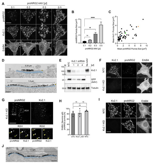 ProNRG2 organizes ER-PM junctions in ErbB4+ GABAergic interneurons. (A,B) Augmenting proNRG2 expression by AAV-mediated transduction dose-dependently increases proNRG2 cluster size without signs of diffuse surface distribution; indicated volumes are per 24-well. Note the concomitant increase in Kv2.1 cluster size that is particularly evident in the 0.5 µL condition. ProNRG2 cluster sizes shown in (B) represent the mean ± SEM (n = 713 (0.1 µL), 1211 (0.2 µL), 907 (0.3 µL), 1044 (0.5 µL) clusters from 11–13 ErbB4+ neurons per condition and two independent experiments). *, p < 0.05; ****, p < 0.0001; ns, not significant (one-way ANOVA). (C), Scatter plot illustrating the correlation of proNRG2 and Kv2.1 mean cluster sizes in neurons overexpressing proNRG2 (n = 60 neurons from three independent experiments). Colored data points are from neurons shown in panel A (magenta: 0.1 µL; blue: 0.2 µL; green: 0.3 µL; orange: 0.5 µL AAV). (D), Representative electron micrographs showing dense patches of the proNRG2 immunogold signal at the plasma membrane (marked by asterisks) that align with the underlying SSC. The top micrograph shows a small patch of proNRG2 signal that is concentrated over the center of the SSC while sparing its periphery. This distribution resembles endogenous proNRG2 that is frequently found at the open center of doughnut-shaped Kv2.1 clusters [8]. Note the lack of signal outside of the junctional region (arrowheads) and the extensive alignment of the very large proNRG2 cluster with the underlying SSC in the bottom image. See also Figure S1 for uncropped overviews and magnified areas without SSC shading. (E), shRNA-mediated knockdown dramatically reduces Kv2.1 protein levels in AAV-transduced neurons expressing a potent Kv2.1 shRNA compared to neurons transduced with nontargeting control (NTC) or untransduced neurons (UTC). GFP and tubulin signals included as transduction and loading controls, respectively. (F), Similar proNRG2 clusters are found in ErbB4+ GABAergic interneurons under both control (NTC) and Kv2.1 knockdown conditions (Kv2.1-KD). (G), Superresolution (Airyscan) micrograph of a Kv2.1 knockdown neuron, with two regions of interest magnified below, showing examples of proNRG2 puncta either accompanied by a residual Kv2.1 signal (ROI1; open arrowheads) or lacking a detectable Kv2.1 signal (ROI2; filled arrowheads). (H), Kv2.1 knockdown does not affect the number of ErbB4+ neurons with proNRG2 puncta compared to nontargeting (UTC) or untransduced control (NTC) neurons; data represent the mean ± SEM of 275 (NTC), 250 (Kv2.1-KD), and 245 (UTC) neurons from three independent experiments. ns, p > 0.05 (Kruskal–Wallis test). (I), Kv2.1 knockdown does not affect the clustering of overexpressed proNRG2 in neurons co-transduced with AAVs expressing shRNA and proNRG2. (J), Electron micrograph of a Kv2.1 knockdown neuron showing an extensive patch of proNRG2 immunogold signal at the plasma membrane that is accompanied by a similarly long SSC. See also Figure S1 for uncropped overviews and magnified areas without SSC shading. Scale bars: (A,F,G) (overviews) and (I) = 10 µm; (D) = 100 nm (top) and 200 nm (bottom); (G) = 2 µm (ROIs); (J) = 200 nm.
