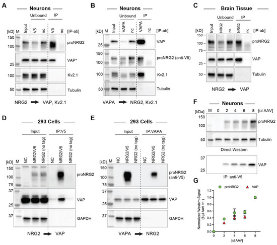 ProNRG2 and VAP co-immunoprecipitate in cultured neurons, brain tissue, and heterologous cells. (A), IP of epitope-tagged proNRG2 from transduced neuron lysates co-immunoprecipitates VAP detected with mouse monoclonal antibody clone N479/107 against VAPA/B [48], whereas VAP is not detected in the negative control IP lane (nc) using an isotype-matched negative control antibody (anti-GFP; clone N86/6). Importantly, unlike VAP, Kv2.1 is not detected in the V5-IP lane. The asterisk (*) indicates that input and unbound fractions were diluted fivefold for VAP detection. (B), Likewise, proNRG2 is detected along with Kv2.1 in parallel VAPA-IP samples prepared from the same neuron lysates. (C), VAP co-immunoprecipitates with proNRG2 from mouse whole brain lysates following IP with a rabbit polyclonal NRG2 antibody against the extracellular domain (ABN1654). nc, negative control antibody (normal rabbit IgG). (D,E), ProNRG2 and VAP also co-immunoprecipitate in NRG2-transfected 293 cells. IP controls include lysates prepared from cells transfected with proNRG2 lacking the V5 epitope used for IP (no tag) and negative control IP antibodies (anti-GFP in (D); normal rabbit IgG in (E)). (F), Increasing proNRG2 expression in AAV-transduced neurons (0–8 µL per six-well) dose-dependently augments VAP co-immunoprecipitation signals. (G), Densitometric analysis of proNRG2/VAP signals shown in (F). Data are normalized to values obtained for 8 µL AAV (n = three independent experiments).