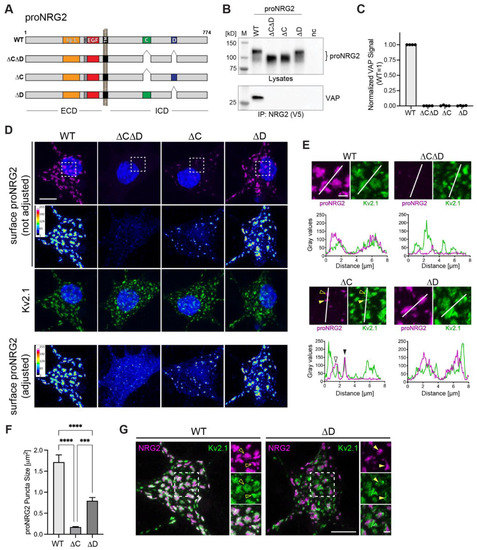 The ICDs of proNRG2 and many NRG1 isoforms harbor two highly conserved motifs denoted as C- and D-boxes [53], and the deletion of an area in the ICD that includes these sequences abolishes proNRG2 accumulation at ER-PM junctions [26]. To directly test their involvement in VAP binding, we generated AAVs harboring three deletion variants that selectively target the C- and D-boxes, either in combination (proNRG2ΔCΔD) or individually (proNRG2ΔC and proNRG2ΔD) (Figure 4A). Co-immunoprecipitation experiments were performed on lysates from transduced neurons using anti-V5, as described above. Although all proNRG2 variants were expressed at similar levels, only WT proNRG2, but none of the deletion variants, was able to co-immunoprecipitate VAP, strongly suggesting that both the C- and D-boxes are required for VAP binding (Figure 4B,C). We then investigated the subcellular distribution of these proNRG2 deletion variants by confocal microscopy to determine the extent to which the C- and D-boxes are necessary for clustering at ER-PM junctions. Transduced neurons were first surface-labeled for proNRG2 and then labeled for Kv2.1 following permeabilization to identify ER-PM junctions. When using imaging conditions that yield minimal saturation for WT proNRG2 clusters (Figure 4D; top), signals for the surface proNRG2ΔCΔD were very low. However, when laser power (Figure 4D; bottom) or expression levels were increased (Figure S3), surface proNRG2ΔCΔD was more readily observed and was found to broadly distribute throughout the soma and dendrites without any apparent accumulation at ER-PM junctions. By contrast, proNRG2ΔC formed small puncta that colocalized with larger Kv2.1 clusters (ΔC: 0.17 ± 0.01 µm2 vs. WT: 1.71 ± 0.17 µm2; Figure 4D–F). Unexpectedly, clustering of proNRG2ΔD was only moderately reduced (ΔD: 0.80 ± 0.08 µm2; Figure 4D–F). However, unlike WT proNRG2, these clusters frequently resided in areas with relatively weak Kv2.1 immunoreactivity that were adjacent to stronger Kv2.1 signals (Figure 4E,G), suggesting that proNRG2ΔD and Kv2.1 localize to the same ER-PM junctions but preferentially accumulate in distinct microdomains. Taken together with our co-immunoprecipitation data, these findings indicate that, in situ, the C-box plays a major role and the D-box plays a minor role in mediating proNRG2-VAP interactions, but cooperative binding via both sequence elements is necessary to form proNRG2/VAP complexes that persist under the more stringent conditions of immunoprecipitation (i.e., in the presence of 1% Triton X-100 and at low protein concentrations in diluted cell lysates).