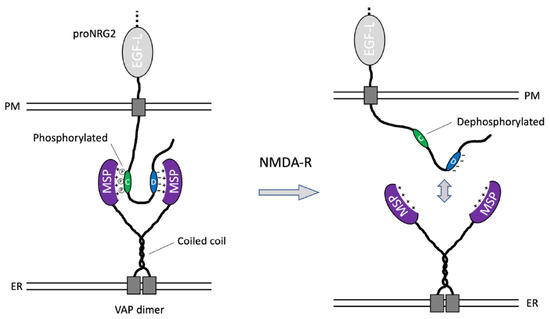 Our data also indicate that proNRG2 binds VAPA/B isoforms with similar affinities. In the adult mouse brain, VAPA expression predominates in the neocortex and hippocampus, while VAPB predominates in selective neuron types including α-motoneurons, where NRG1 clusters at C-bouton ER-PM junctions [22,25,48,67,68]. Whether isoform-selective VAP–proNRG2 interactions are functionally distinct is an interesting question and should be addressed in future studies.